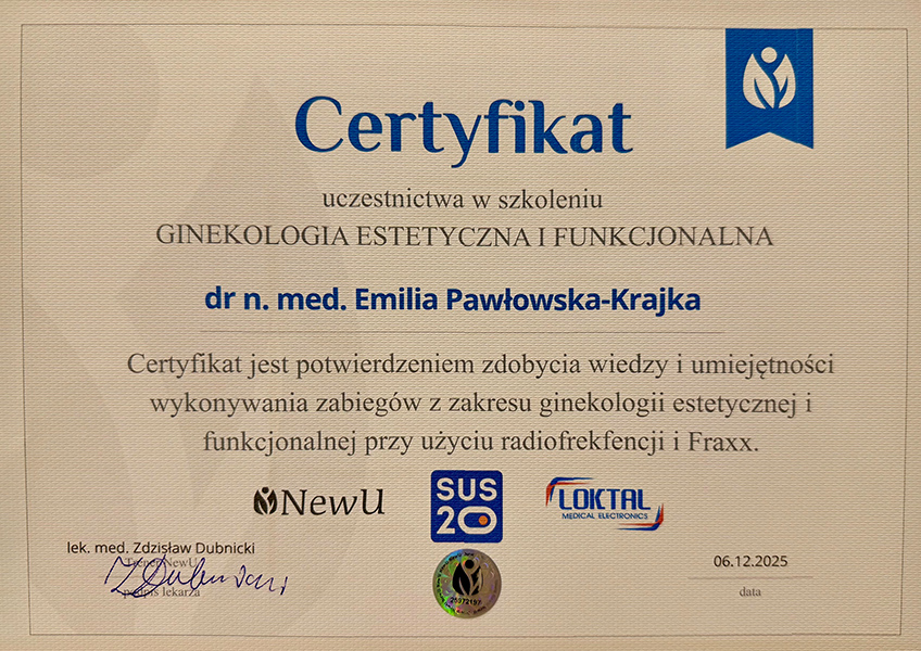 Ukończyłam specjalistyczne szkolenie z ginekologii estetycznej i funkcjonalnej, podczas którego zdobyłam praktyczną wiedzę i umiejętności w leczeniu nietrzymania moczu u kobiet. Szkolenie zostało zorganizowane w Royal Clinic i poprowadził je ekspert, doktor Zdzisław Dubnicki.